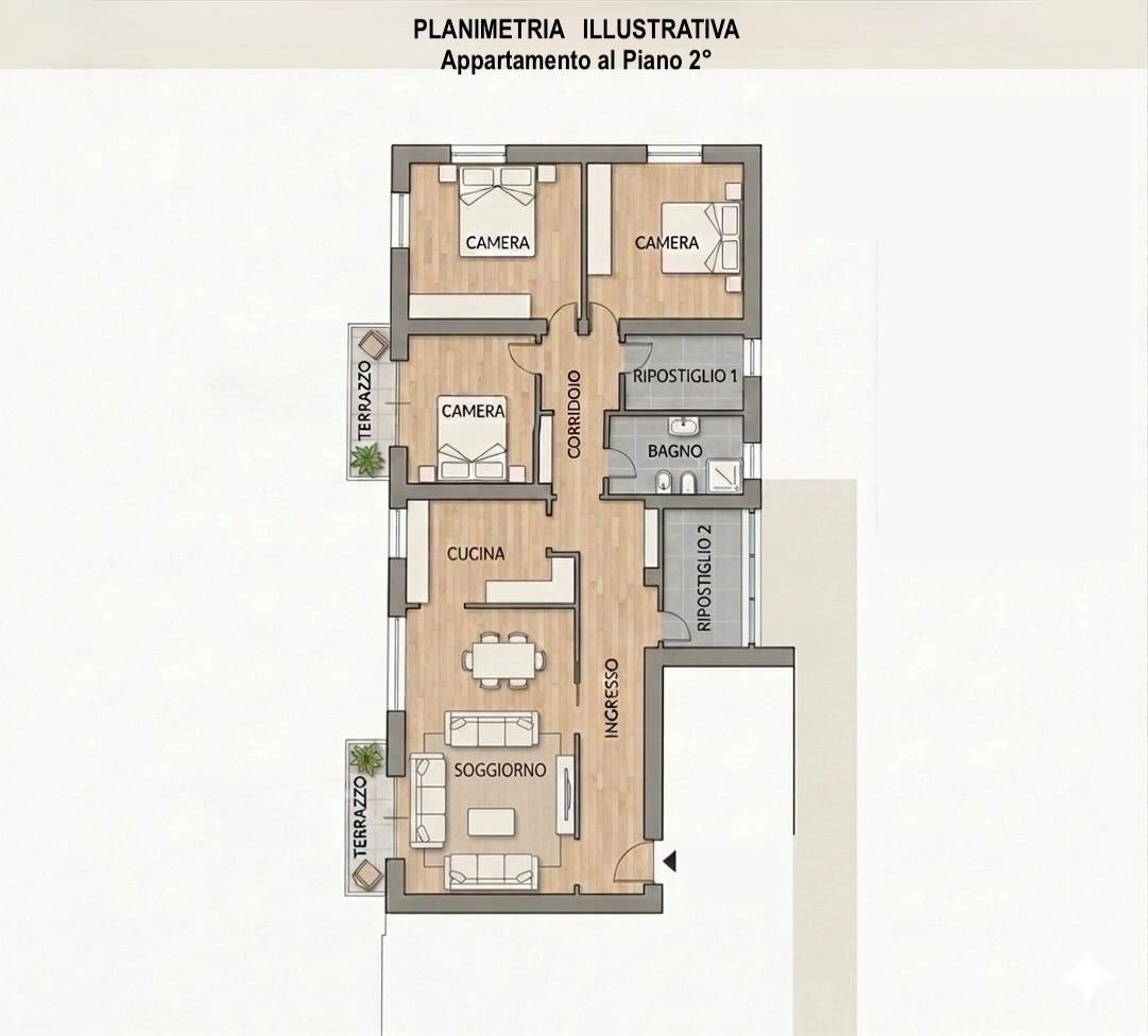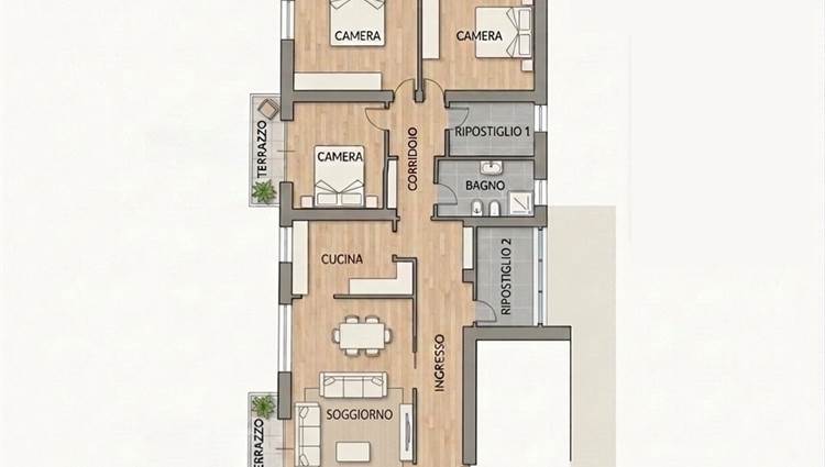 La distribuzione attuale consente inoltre una semplice revisione degli spazi: l’area di ingresso potrebbe essere integrata al soggiorno, ampliando la zona giorno e favorendo una migliore diffusione della luce naturale all’interno dell’ambiente.